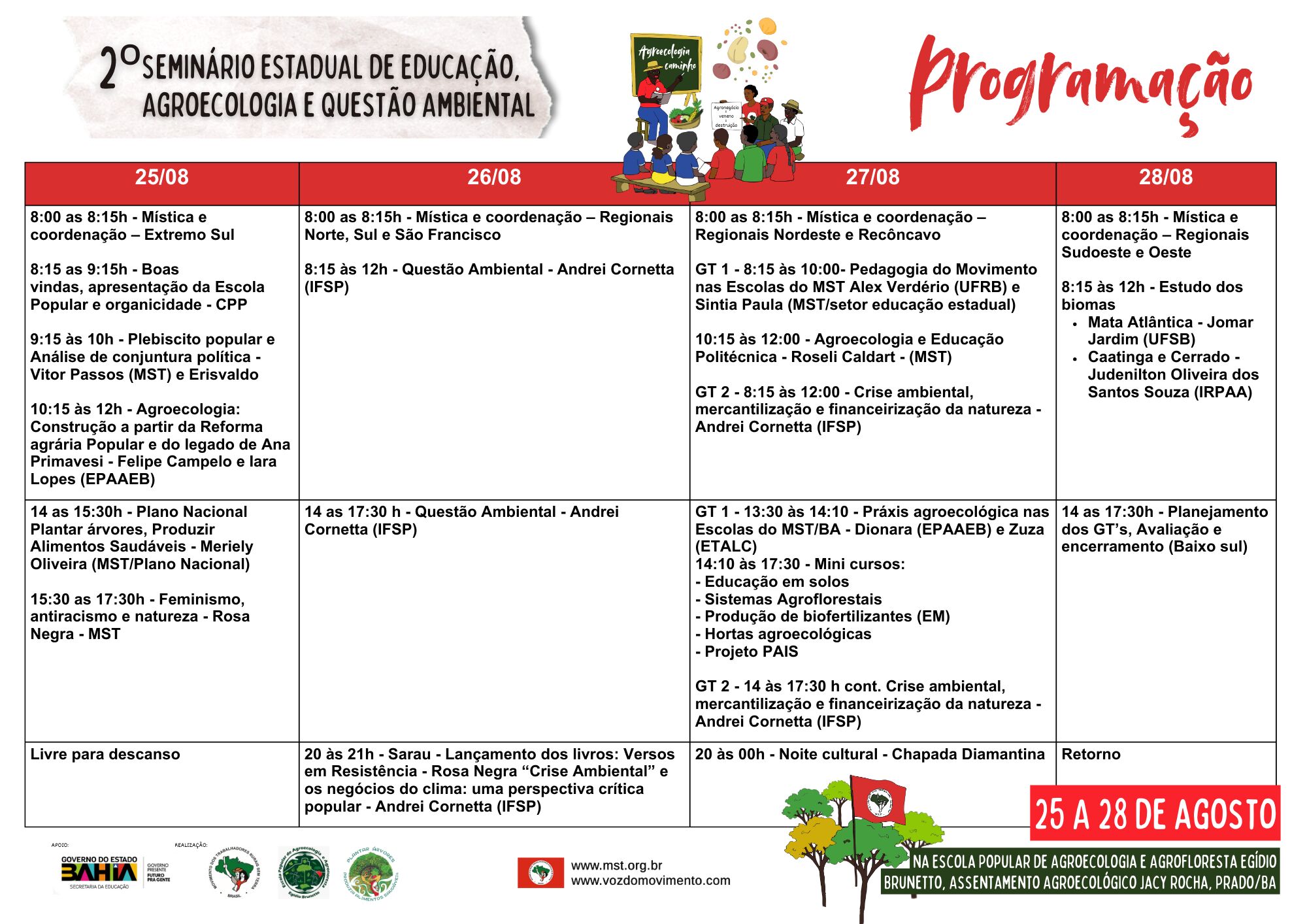 O seminário é organizado pelo setor de Educação do MST na Bahia e pelo coletivo do Plano Nacional Plantar Árvores, Produzir Alimentos Saudáveis, com apoio da Secretaria de Educação do Estado da Bahia.